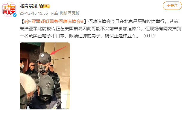 [许亚军疑似现身何晴追悼会]何晴追悼会今日在北京昌平殡仪馆举行,其前夫许亚军此前被传正在美国拍戏因此可能不会前来参加追悼会,但现场有网友拍到一名戴黑色帽子和口罩、眼睛红肿的男子,疑似正是许亚军。