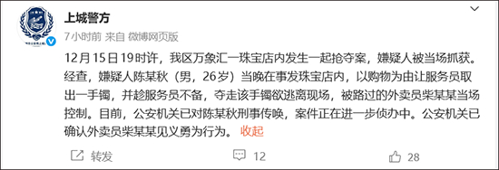杭州警方通报“万象汇珠宝抢夺案”:已确认外卖员见义勇为行为