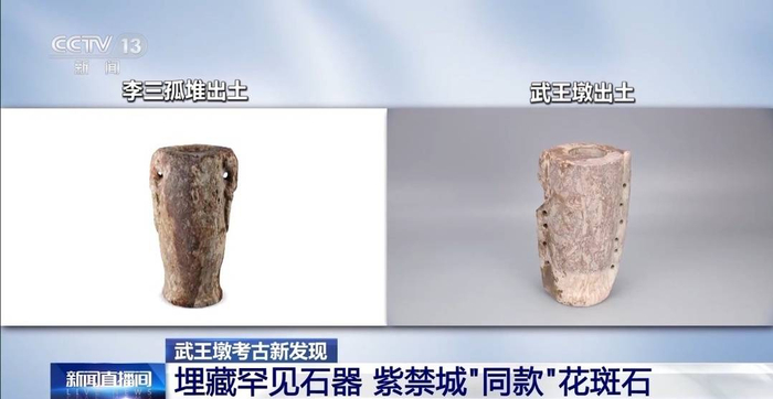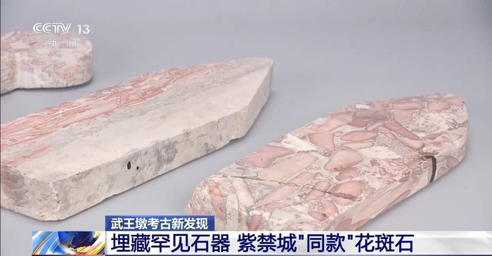 武王墩大墓东侧椁室还出土了20多件极为罕见的花斑石石器。石器出现的原因还有待深度研究,但千余年后的紫禁城也出现了“同款”花斑石。